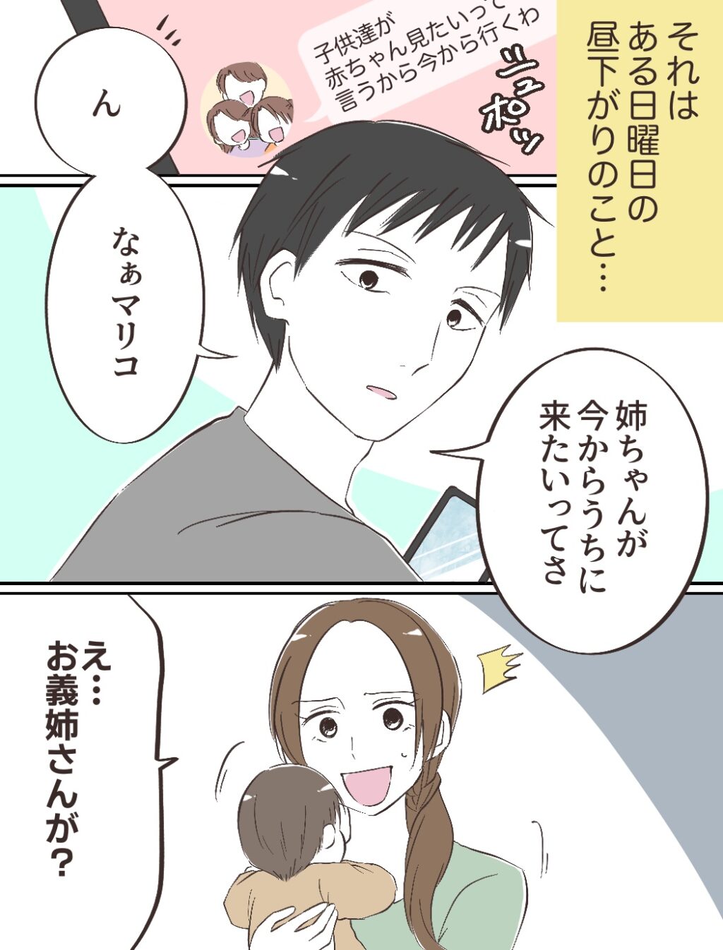 「子どもたちが赤ちゃん見たいって言うから今から行くわ」ヒロキの姉、私にとっては義姉にあたるチエさんからメッセージが!すると、「ん?なぁマリコ、姉ちゃんが今からうちに来たいってさ」ヒロキにそう言われ、「え・・お義姉さんが?」と思わず顔がひきつりました。