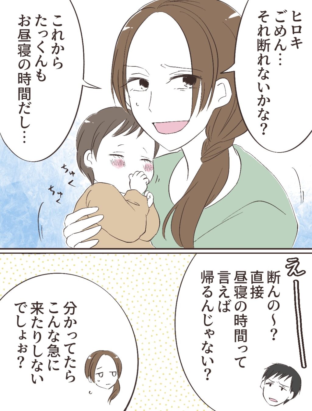 「ヒロキごめん・・それ断れないかな?これからたっくんもお昼寝の時間だし・・」とたっくんが静かにお昼寝するためにも、チエさんたちには来てもらいたくない。そう思っていたのですが、「えーーっ!断んの~?直接昼寝の時間って言えば帰るんじゃない?」断るのがイヤでそう言うヒロキに、「分かってたらこんな急に来たりしないでしょぉ?」とちょっぴり呆れたように言う私。