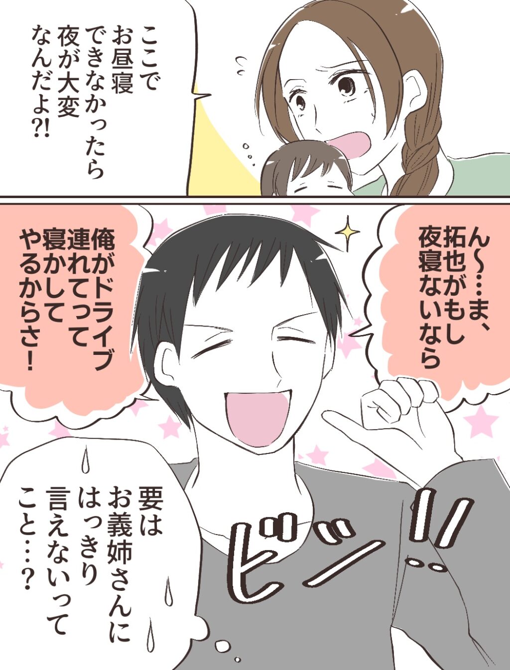 さらに、「ここでお昼寝できなかったら夜が大変なんだよ!?」と追い打ちをかけるも、「ん~・・ま、拓也がもし夜寝ないなら、俺がドライブ連れてって寝かしてやるからさ!」とすっかり受け入れる気満々のヒロキ。「要はお義姉さんにはっきり言えないってこと・・?」と心の中で呟きました。