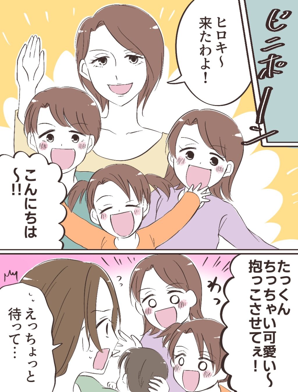 そして、ピンポーン。と玄関のインターホンが鳴り、「ヒロキ~来たわよ!」「こんにちは~!!」とチエさんと子どもたちがやって来ました。「たっくん、ちっちゃい可愛い~!抱っこさせてぇ!」と一気にたっくんの周りを囲む子どもたちに、「えっ、ちょっと待って・・・」と驚く私。