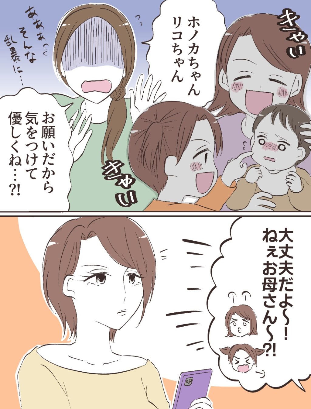その後、「ホノカちゃん、リコちゃん、お願いだから気をつけて優しくね・・!?」と言うも、お構いなしにたっくんを抱っこして触ることもたちに、「あああ・・そんな乱暴に・・」と不安でいっぱい!