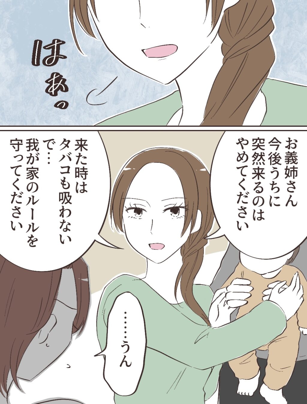 私はチエさんに「お義姉さん、今後うちに突然来るのはやめてください。来た時はタバコも吸わないで・・・我が家のルールを守ってください。」と守ってほしいことを伝えました。私の話を聞いてチエさんは素直に「・・・うん」と返事をしてくれました。