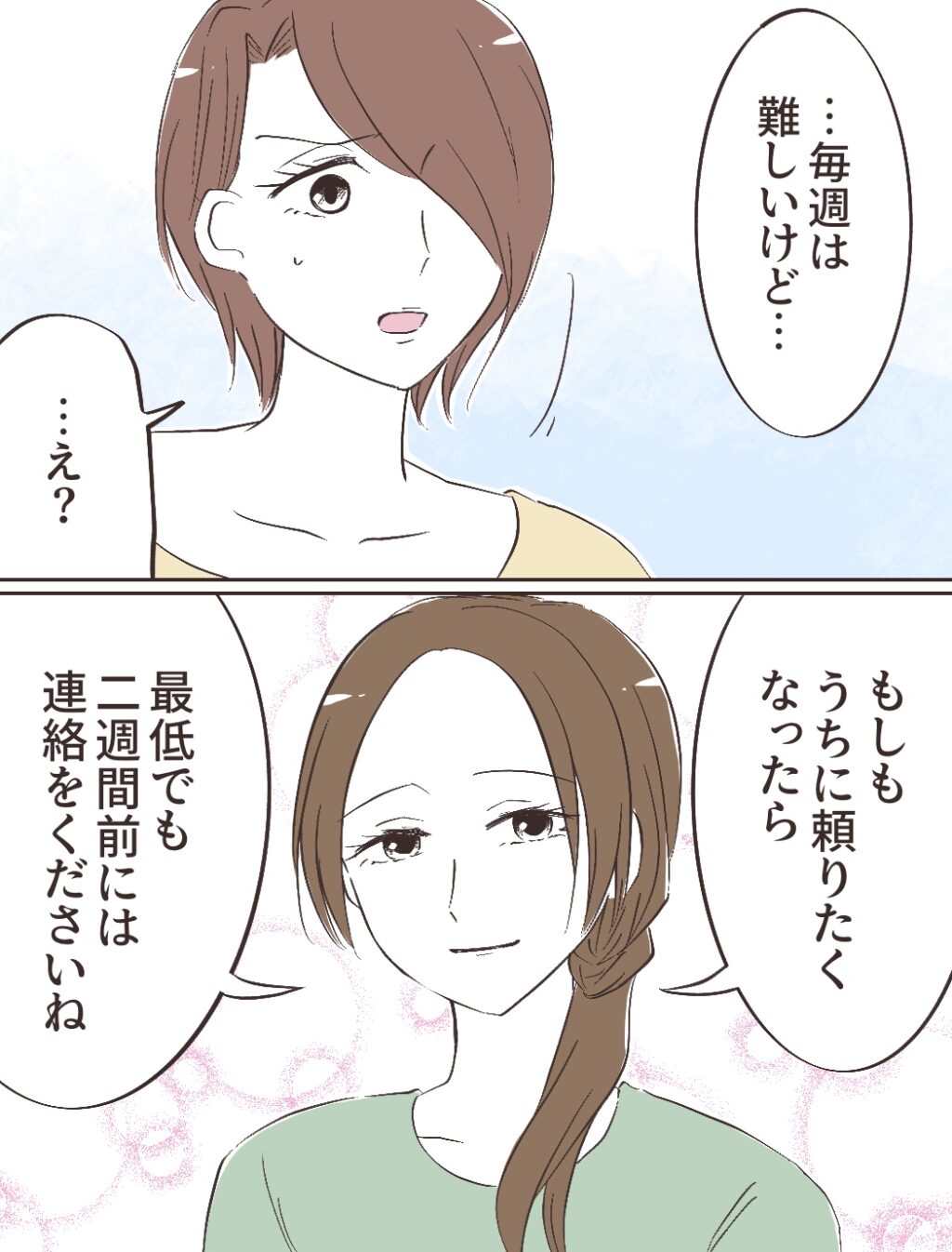 そして「毎週は難しいけど・・・もしもうちに頼りたくなったら最低でも2週間前には連絡くださいね。」とチエさんに言うと少し驚いたような顔をしました。