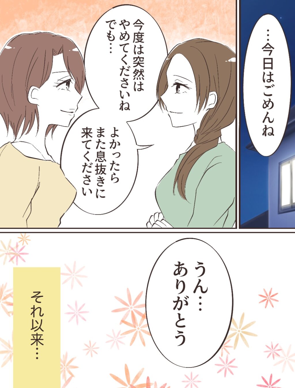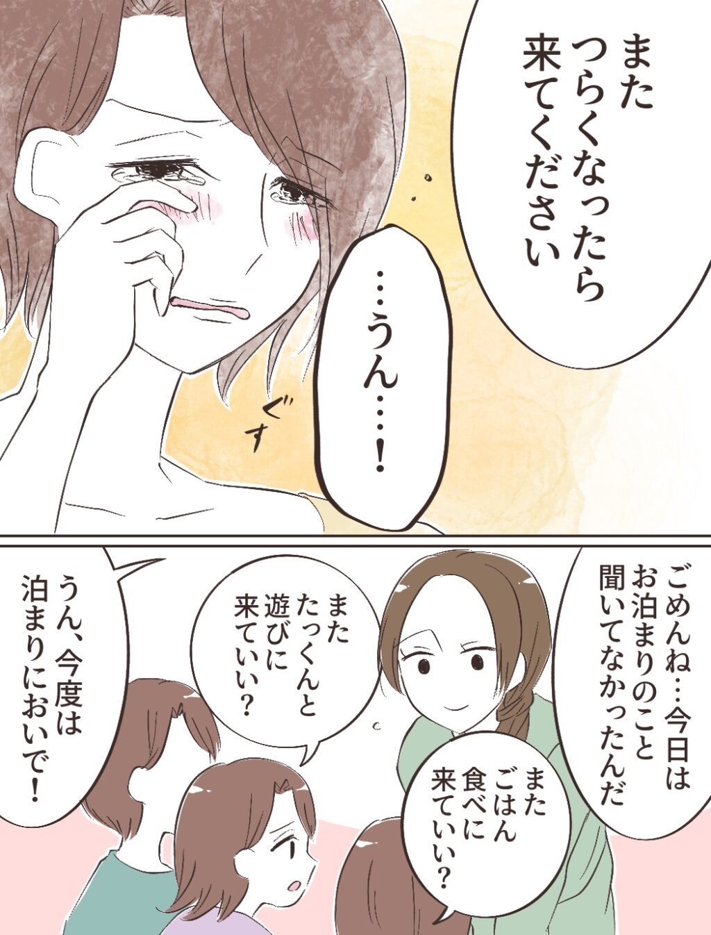 「またつらくなったら来てください」と声をかけると、チエさんは目を潤ませて「うん・・・!」と頷きました。母が泣く姿を見て心配している子ども達に「ごめんね・・・今日はお泊りのこと聞いてなかったんだ」と伝えると「またごはん食べに来ていい?」「またたっくんと遊びに来ていい?」と聞かれ、私は「今度は泊まりにおいで!」と言いました。