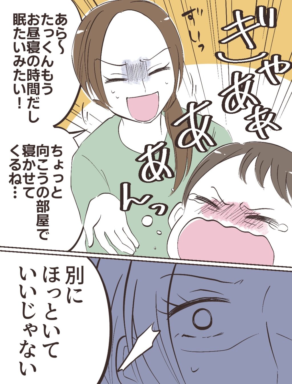見かねて「あら~、たっくんもうお昼寝の時間だし眠たいみたい!ちょっと向こうの部屋で寝かせてくるね・・」そう言ってたっくんを抱き上げようとすると、「別にほっといていいじゃない」とチエさんの声が。