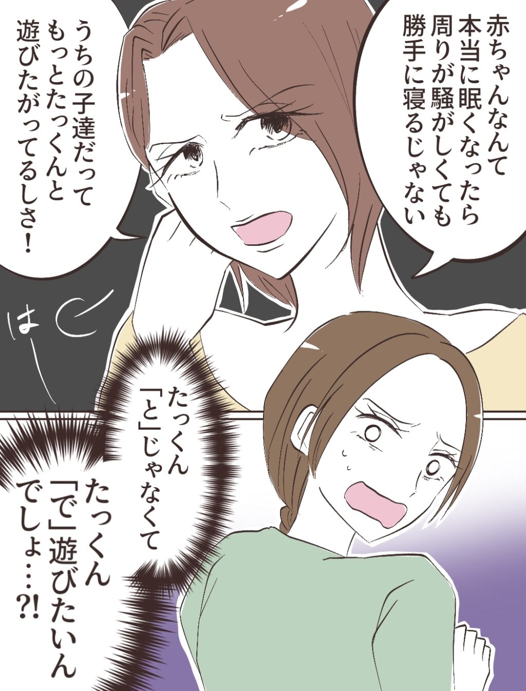 「赤ちゃんなんて、本当に眠くなったら、周りが騒がしくても勝手に寝るじゃない。うちの子達だって、もっとたっくんと遊びたがってるしさ!」とため息をつきながら言うチエさんの言葉に、「たっくん『と』じゃなくて、たっくん『で』遊びたいんでしょ・・!?」と心の中で毒づく私。