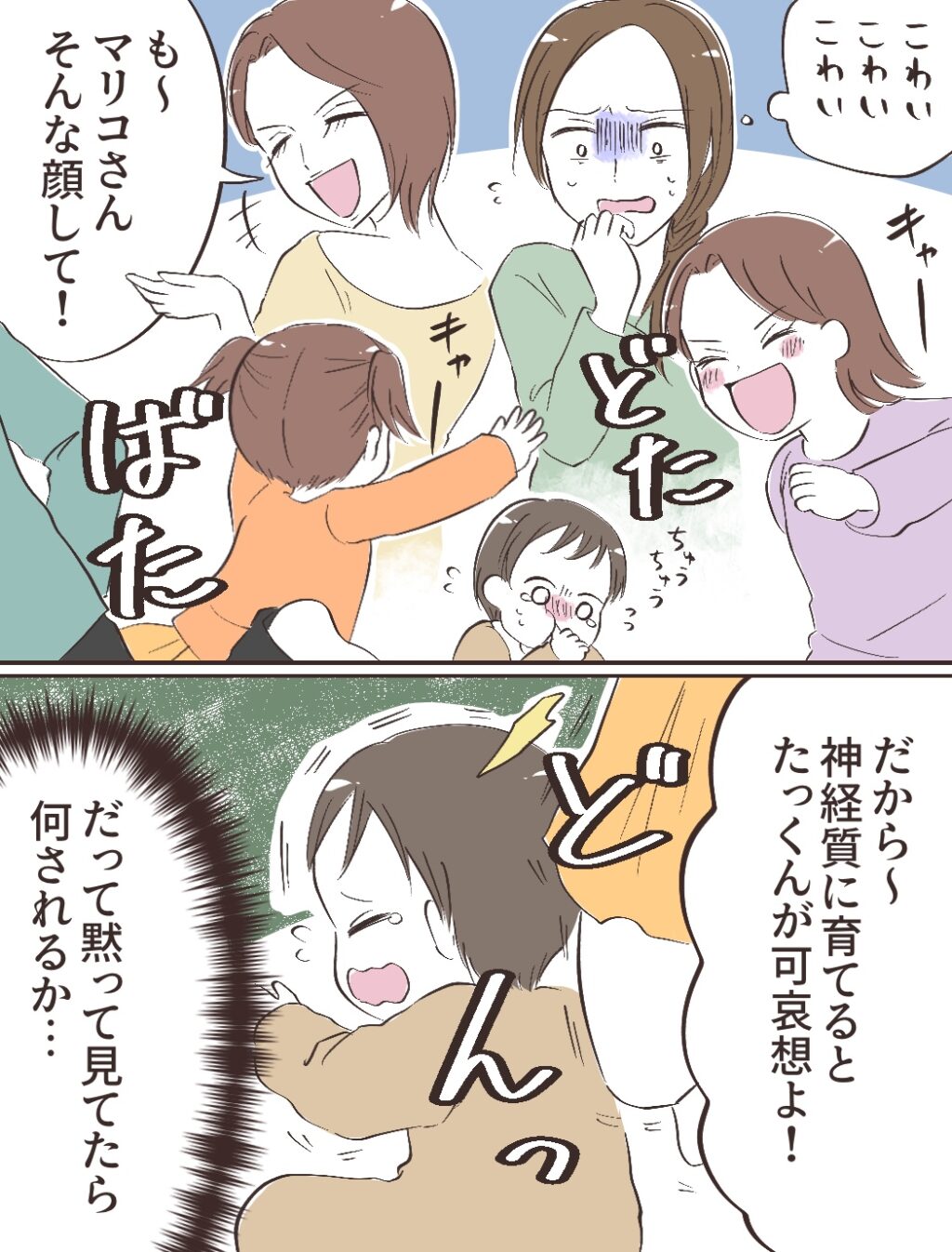 たっくんの周りをどたばたと駆け回る子ども達を見て「こわいこわいこわい」と血の気が引く私に、「も~、マリコさんそんな顔して!だから~、神経質に育てるとたっくんが可哀想よ!」と笑いながらチエさんにそう言われ、「だって黙って見てたら何されるか・・」と思っていると、どんっ!!とリコちゃんの足がたっくんにあたって・・!!