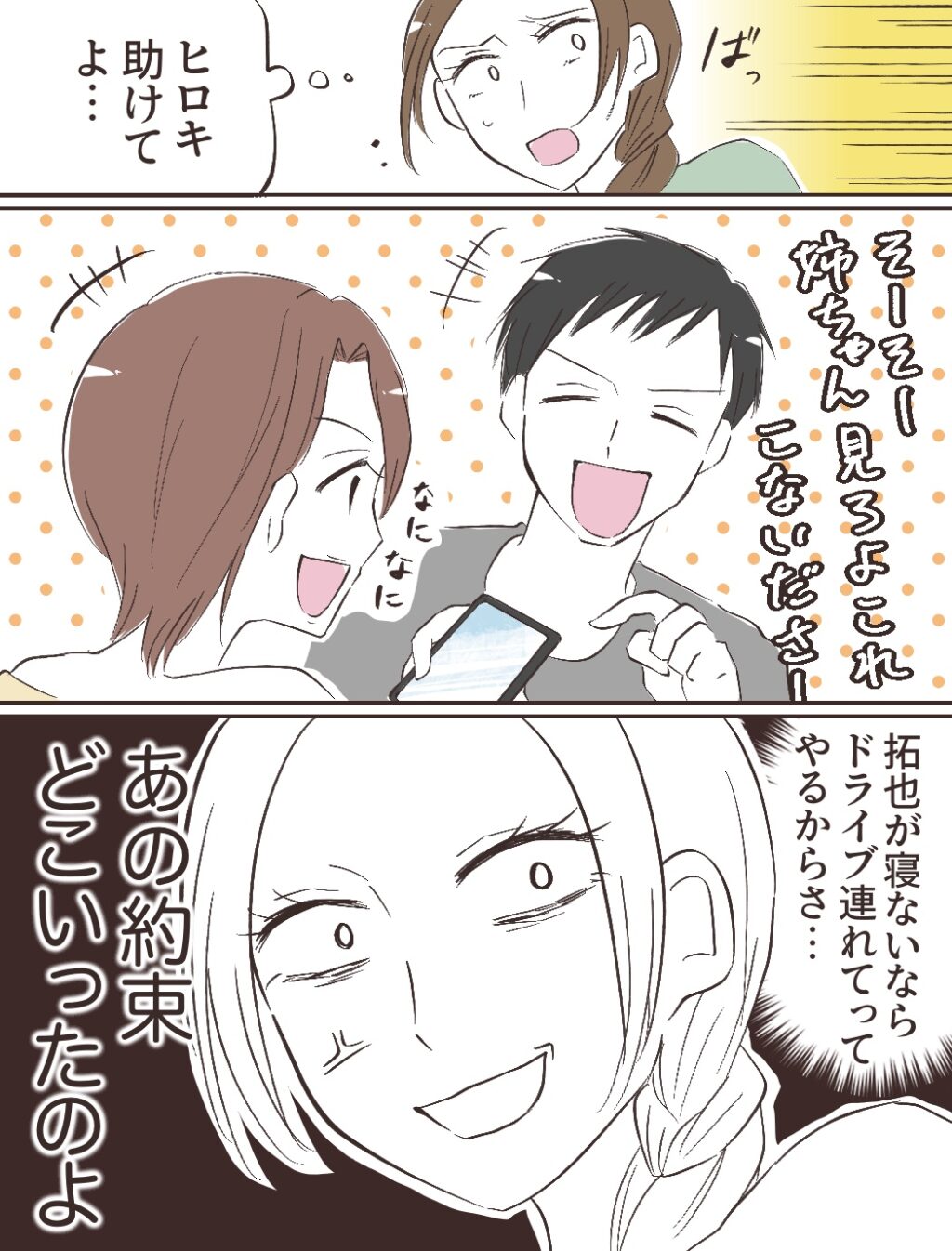 こんな時こそ、「ヒロキ助けてよ・・」そう思ってヒロキの方を見ると、「そーそー姉ちゃん見ろよコレ。こないださー」「なになに」と楽しそうにチエさんと話しているのを見て、「拓也が寝ないならドライブ連れてってやるからさ・・」と言っていた、あの約束どこいったのよ!そう思いながら怒りがこみ上げるのでした。