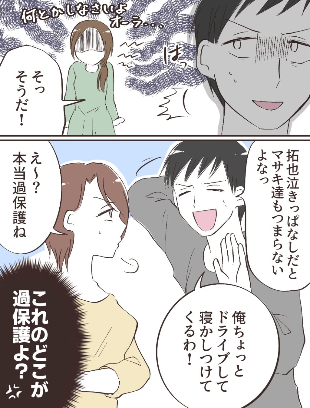 そんな私の、何とかしなさいよオーラを感じたのか、「そっそうだ!」と突然言い出したヒロキ。「拓也泣きっぱなしだとマサキ達もつまらないよなっ。俺ちょっとドライブして寝かしつけてくるわ!」とチエさんに言うと、「え~?本当過保護ね」と呆れたように言い、それを見ていた私は「これのどこが過保護よ?」と心の中で叫びました。