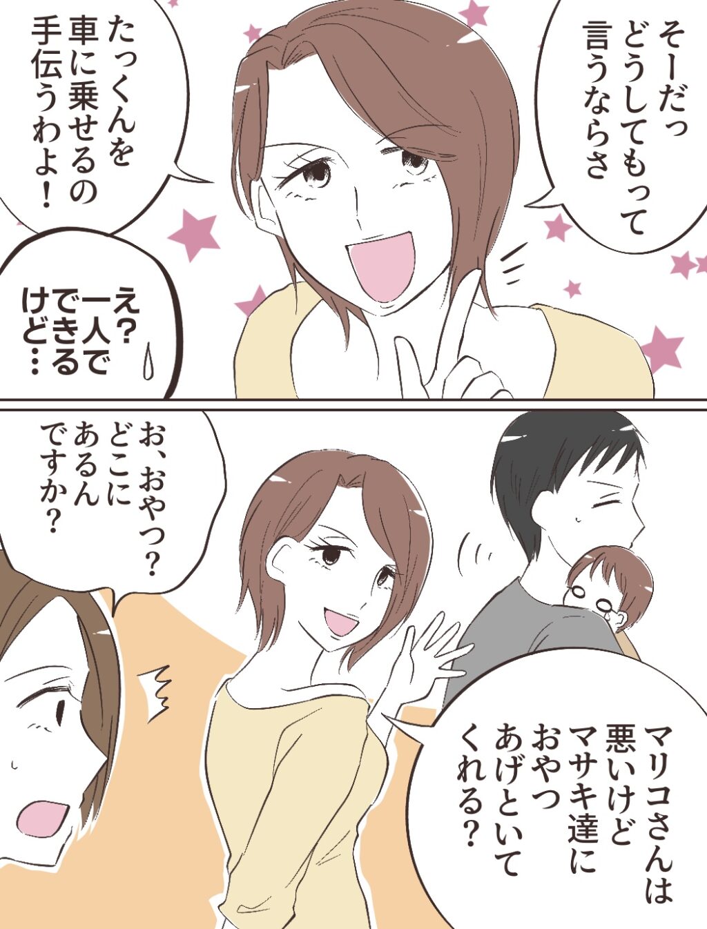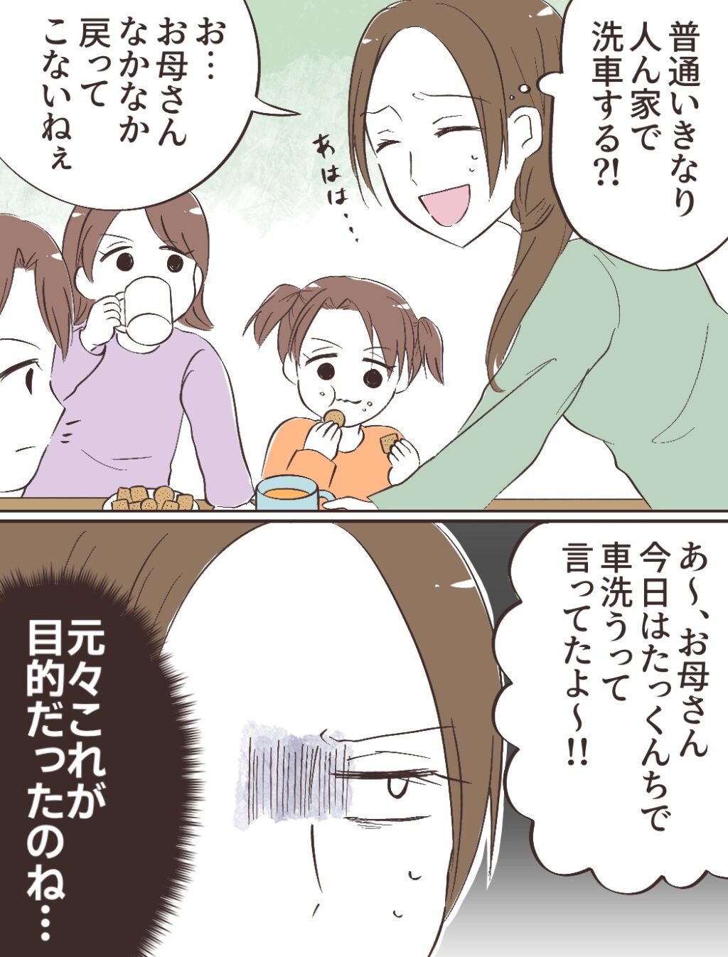 「ヒロキ助けてよ」とマリコさんが思ったものの、ヒロキさんはチエさんと話していて素知らぬふり。でも、「何とかしなさいよ」というオーラを感じ取ったのか、「俺ドライブして寝かしつけてくるわ」と出かける準備を始めました。すると、手伝うと言って一緒に外に出て行こうとするチエさんに、「子どもにおやつあげといて」と言われ、「どこにあるんですか?」とたずねると、「家にあるのを出してって意味に決まってる」と言い捨てて出て行ってしまいました。その後、子ども達に囲まれておやつを出していると、ブーンと音が!何事かと外を見ると、家のガレージで自分の車を洗うチエさんを見てビックリ!動揺しながら「お・・お母さんなかなか戻ってこないねぇ」と言うと、「あ~、お母さん今日はたっくんちで車洗うって言ってたよ~!!」と言われ、「元々これが目的だったのね・・」とドン引きしました。