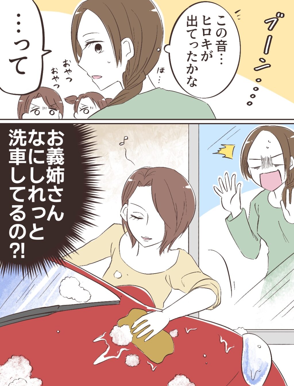 すると、ブーン・・と音がして、「この音・・ヒロキが出てったかな」と子ども達におやつをあげながら外を見ると、「・・・ってお義姉さん、なにシレっと洗車してるの!?」と驚く私。なんと、家のガレージに自分の車を停め、チエさんが大胆に洗車していました。