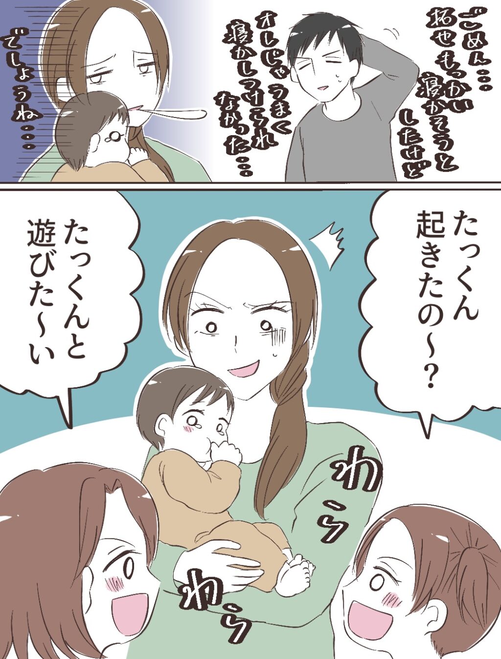 そして、「ごめん・・拓也もっかい寝かそうとしたけど、オレじゃうまく寝かしつけられなかった・・」とヒロキに言われ、「でしょうね・・」と呆れる私。