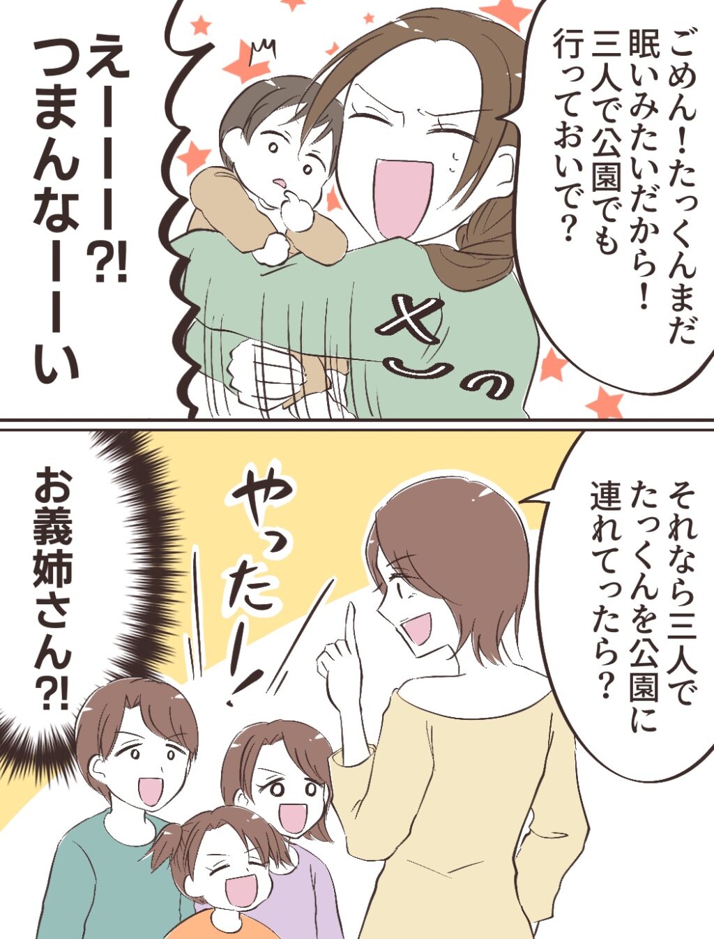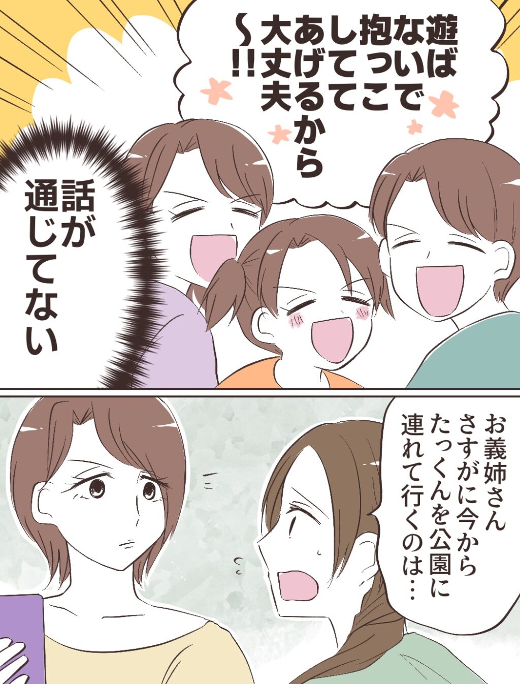 「遊ばないで抱っこしててあげるから大丈夫~!!」と笑顔で言われ、「話が通じてない」と唖然。「お義姉さん、さすがに今からたっくんを公園に連れて行くのは・・」と訴えかけると、