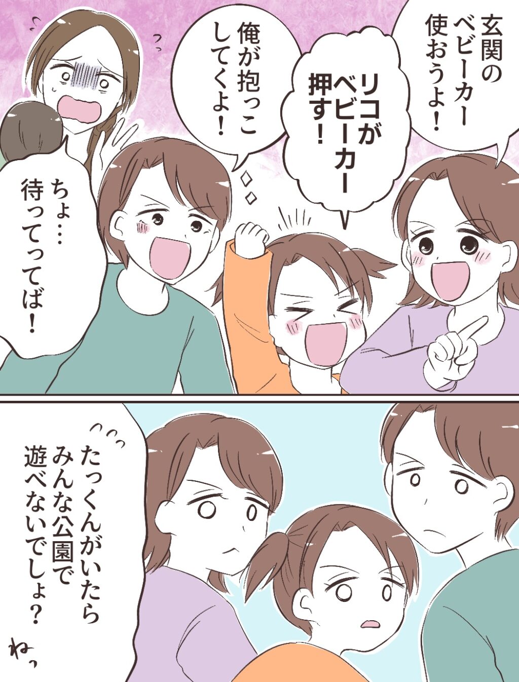 そして、「玄関のベビーカー使おうよ!」「リコがベビーカー押す!」「俺が抱っこしてくよ!」と言いたい放題の子ども達に「ちょ・・待ってってば!たっくんがいたら、みんな公園で遊べないでしょ?ねっ」子ども達に言い聞かせようとするも、