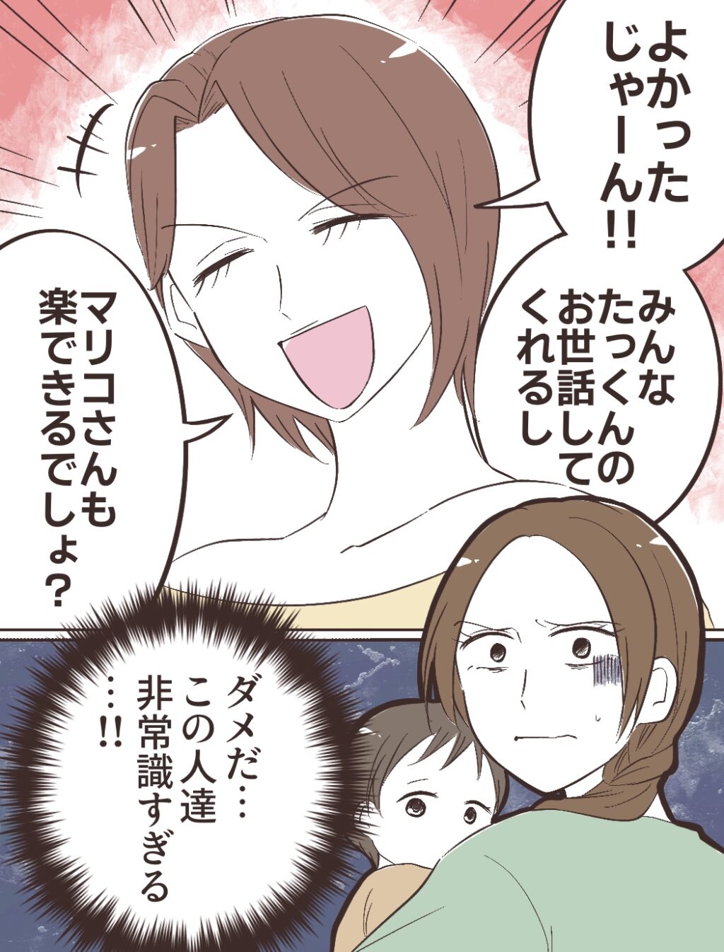 「よかったじゃーん!!みんなたっくんのお世話してくれるし、マリコさんも楽できるでしょ?」と笑顔で言われ、「ダメだ・・この人達非常識すぎる・・!!」と危険を感じました。
