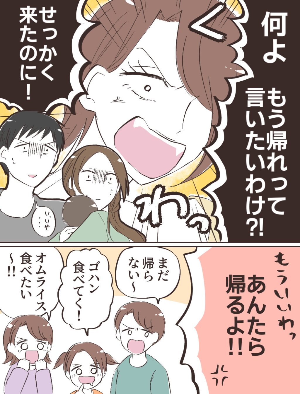 「何よ!もう帰れって言いたいわけ!?せっかく来たのに!」と怒り出すチエさんが、「もういいわっ!あんたら帰るよ!!」と子ども達に言うと、「まだ帰らない~」「ゴハン食べてく!」「オムライス食べたい~!!」と口々に文句を言う子ども達の言葉を聞いて、