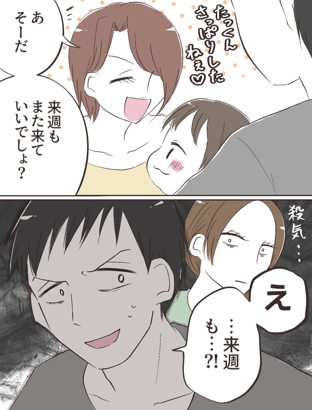 そして、「たっくん、さっぱりしたねぇ」とたっくんに声をかけた後、「あ、そーだ。来週もまた来ていいでしょ?」チエさんがサラリと言い、「え・・来週も・・!?」と私の殺気を感じながらヒロキがそう言いました。