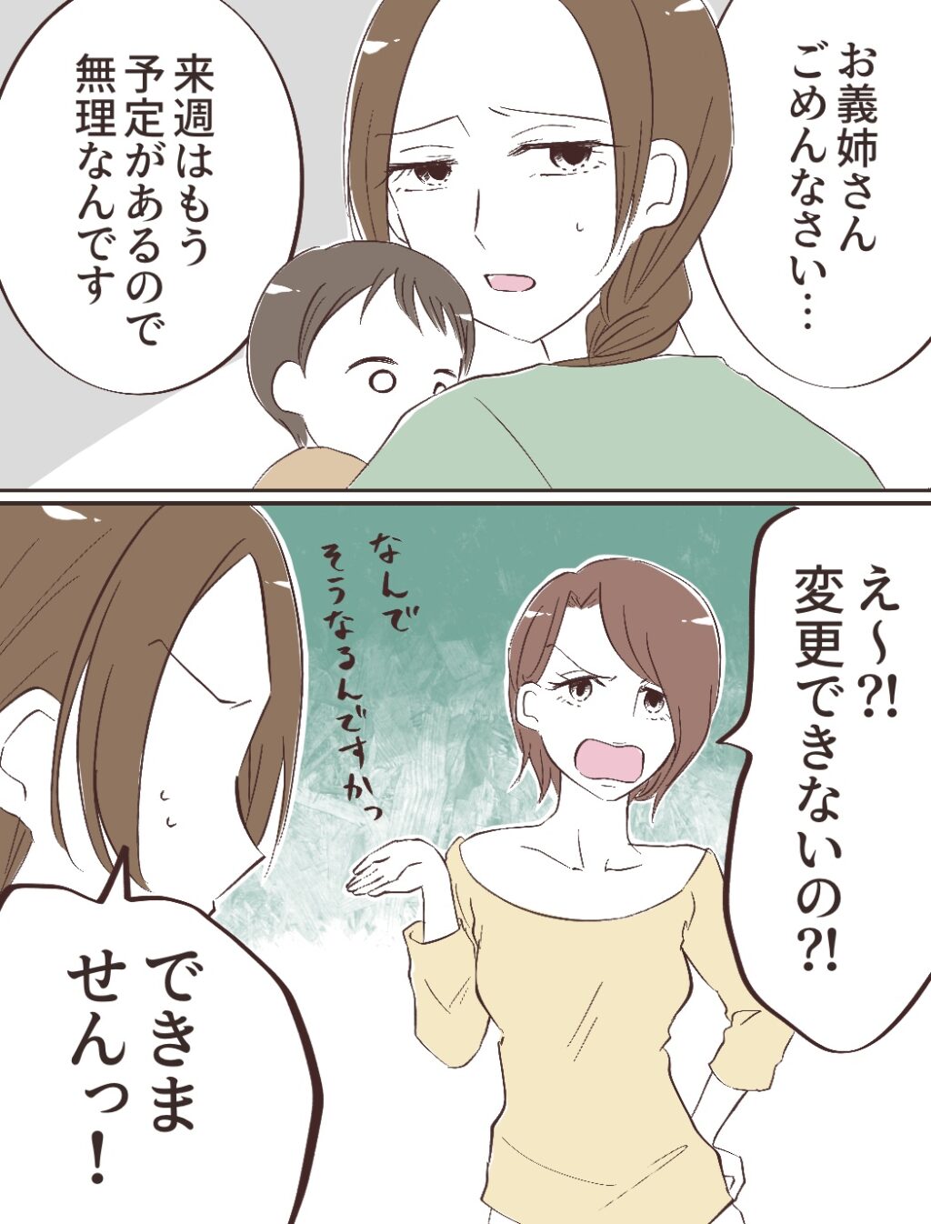 「お義姉さんごめんなさい・・。来週はもう予定があるので無理なんです」私がそう言うと、「え~!?変更できないの!?」とチエさんに文句を言われるも、「できませんっ!」と断固拒否!