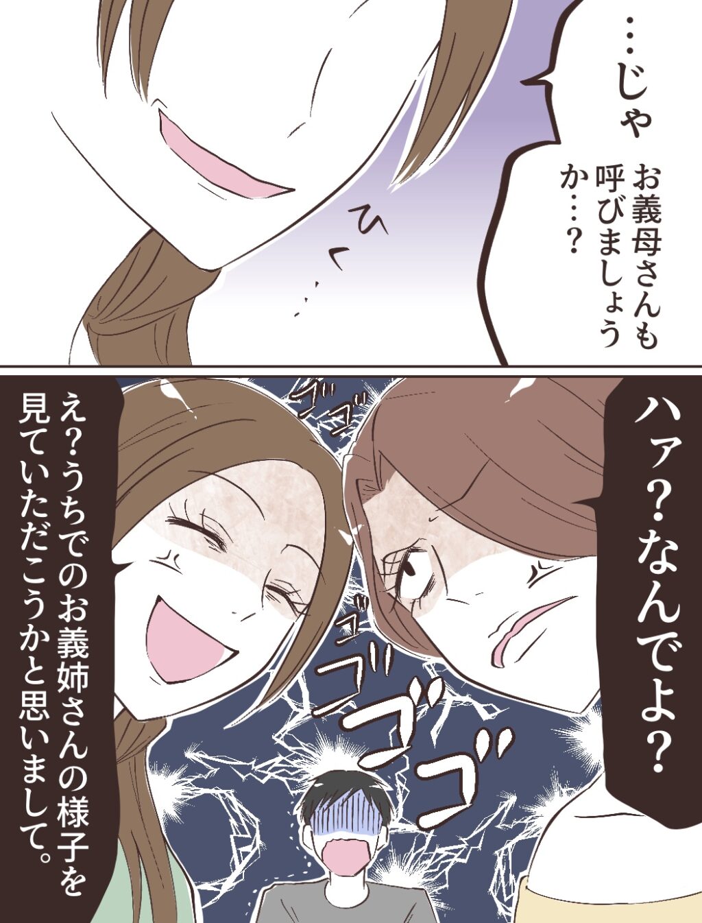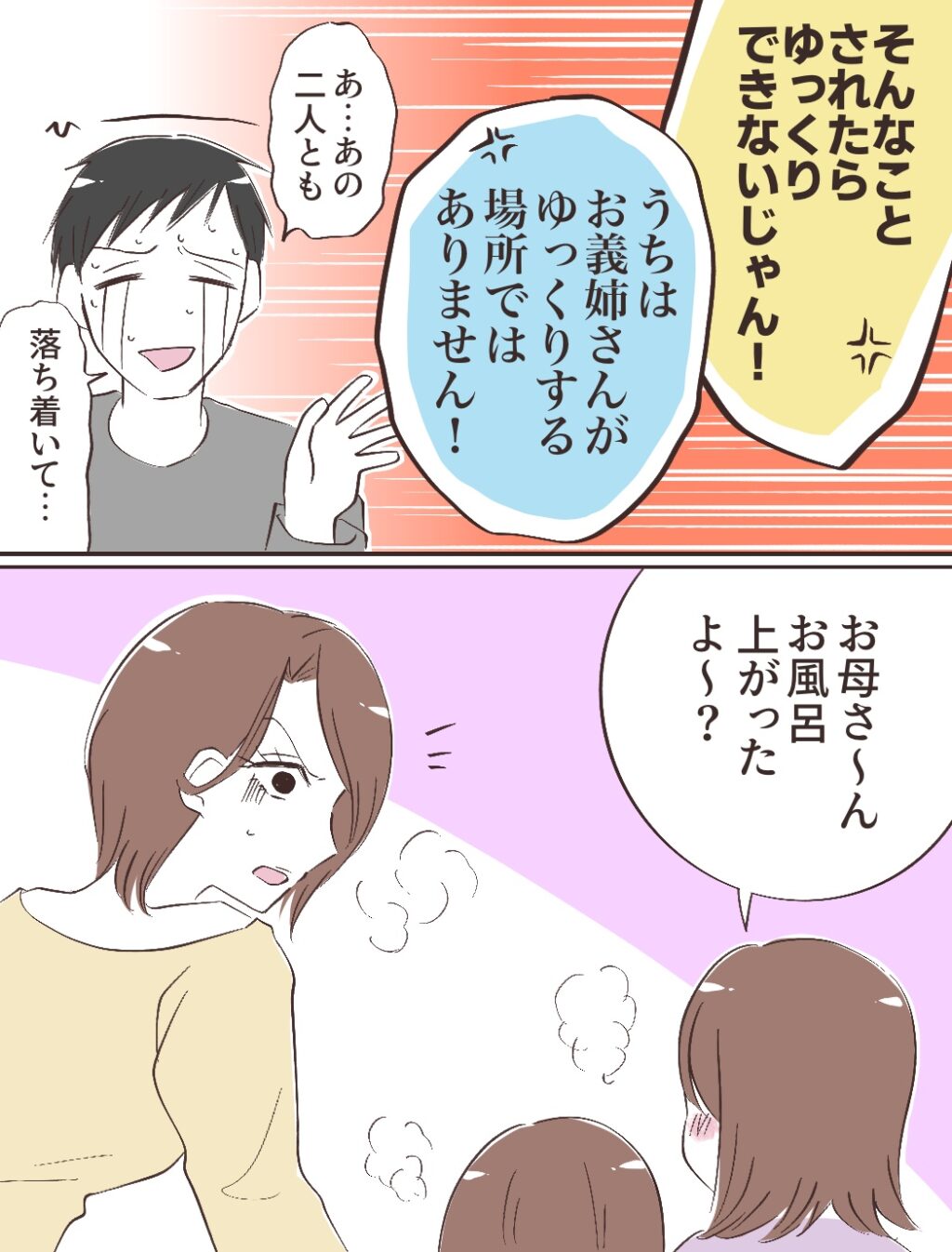 「そんなことされたらゆっくりできないじゃん!」怒り出すチエさんに、「うちはお義姉さんがゆっくりする場所ではありません!」と正論を言い返す私。「あ・・あの二人とも落ち着いて・・」ヒロキが困ったように言うと、「お母さ~ん、お風呂上がったよ~?」とお風呂上りの子ども達が!