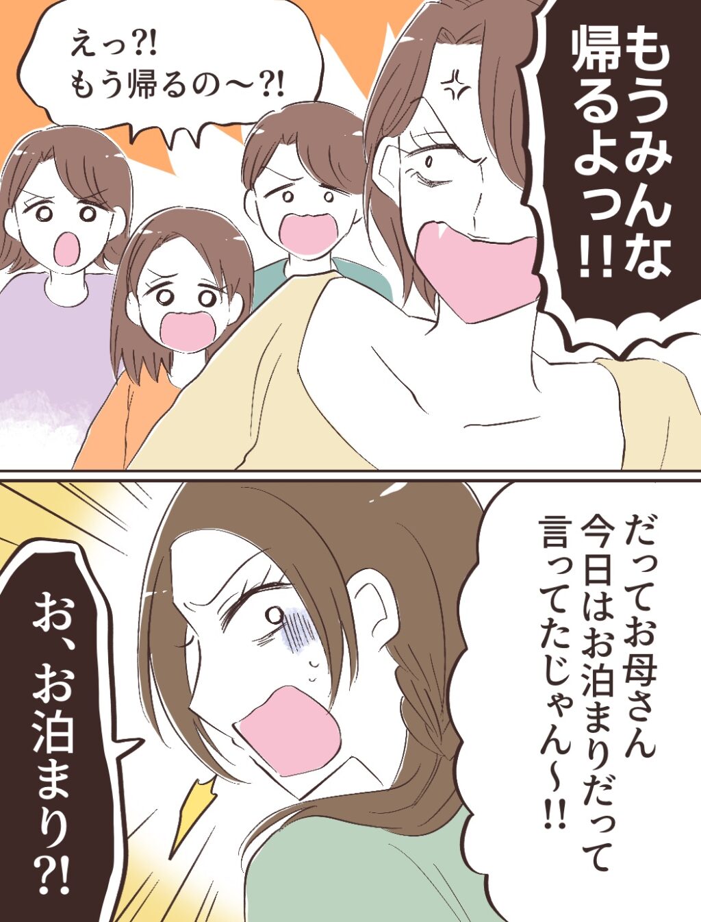「もうみんな帰るよっ!!」怒って言うチエさんに、「えっ!?もう帰るの~!?」と反論する子ども達が「だってお母さん今日はお泊まりだって言ってたじゃん~!!」子ども達の声に「お、お泊まり!?」と思わず言葉を失ってしまいました。