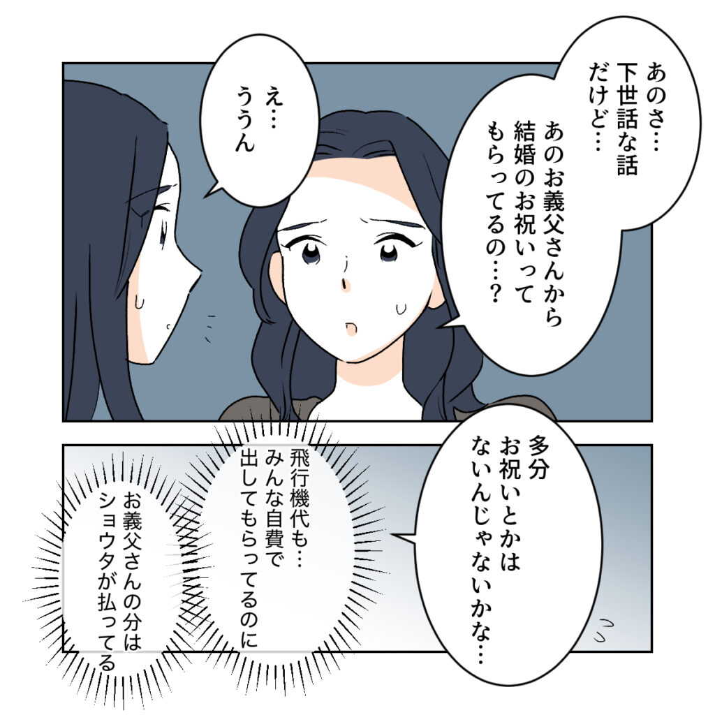 すると、「あのさ・・下世話な話だけど・・あのお義父さんから結婚のお祝いってもらってるの・・?」姉に恐る恐るたずねられ、「え・・ううん。多分お祝いとかはないんじゃないかな・・」と言いながら、「飛行機代も・・みんな自費で出してもらってるのに、お義父さんの分はショウタが払ってる」と心の仲で呟いた後、