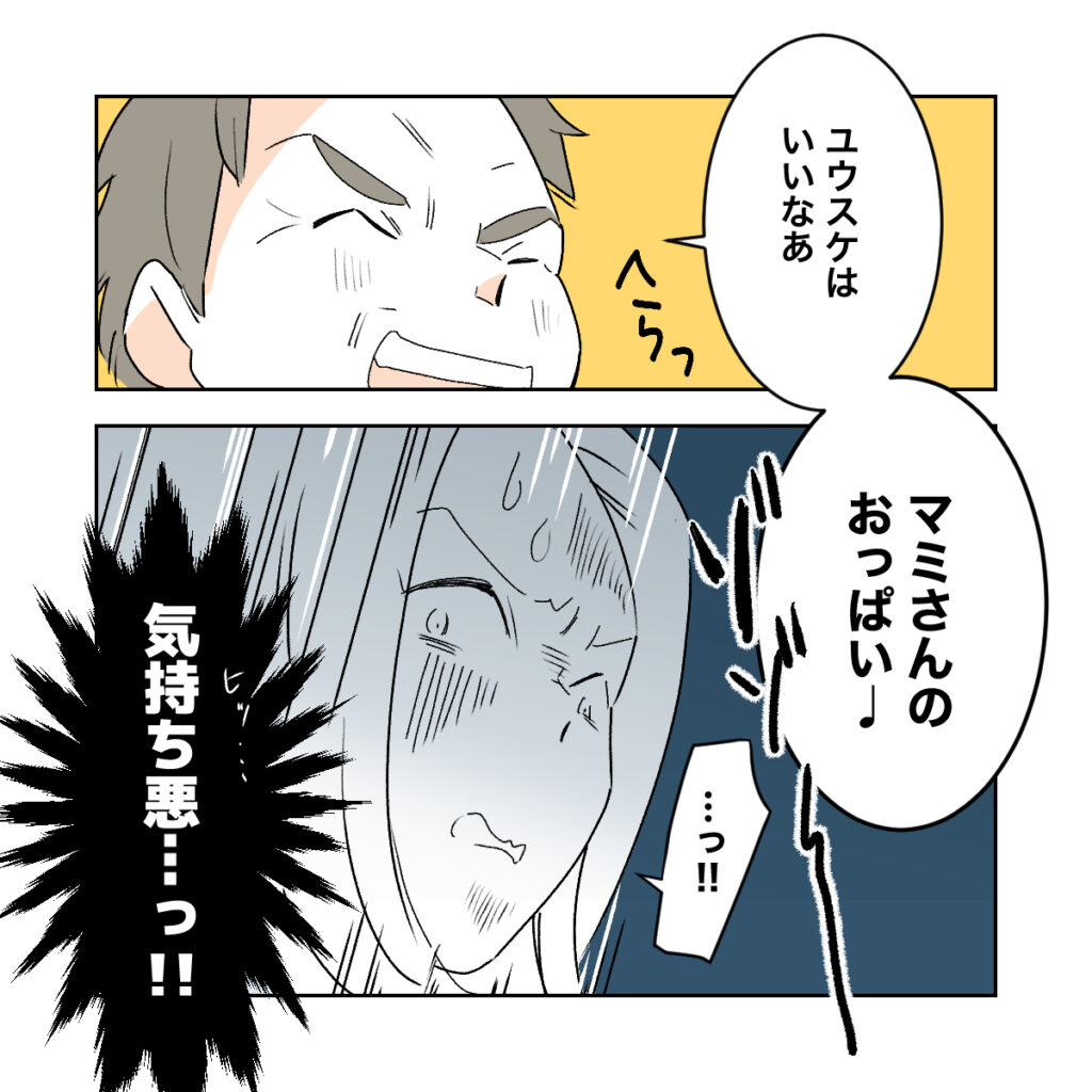 「ユウスケはいいなあ、マミさんのおっぱい」ヘラヘラと笑いながら言う義父に、思わず背筋が凍ります。息子の妻に対してこんなことを平気で言えるなんて・・・一体何を考えているのか、気持ち悪くて仕方ありませんでした。