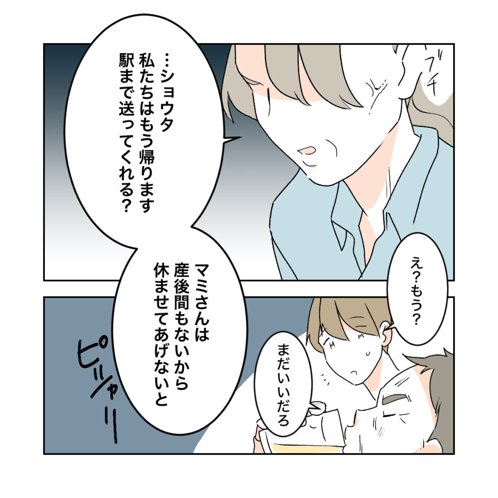 度重なる義父の非常識な言動に、ついに義母の堪忍袋の緒が切れたようで、「私たちはもう帰ります、駅まで送ってくれる?マミさんは産後間もないから休ませてあげないと」とショウタに向かって冷たく言いました。その言葉に、ショウタは驚き「え?もう?」と声をあげます。