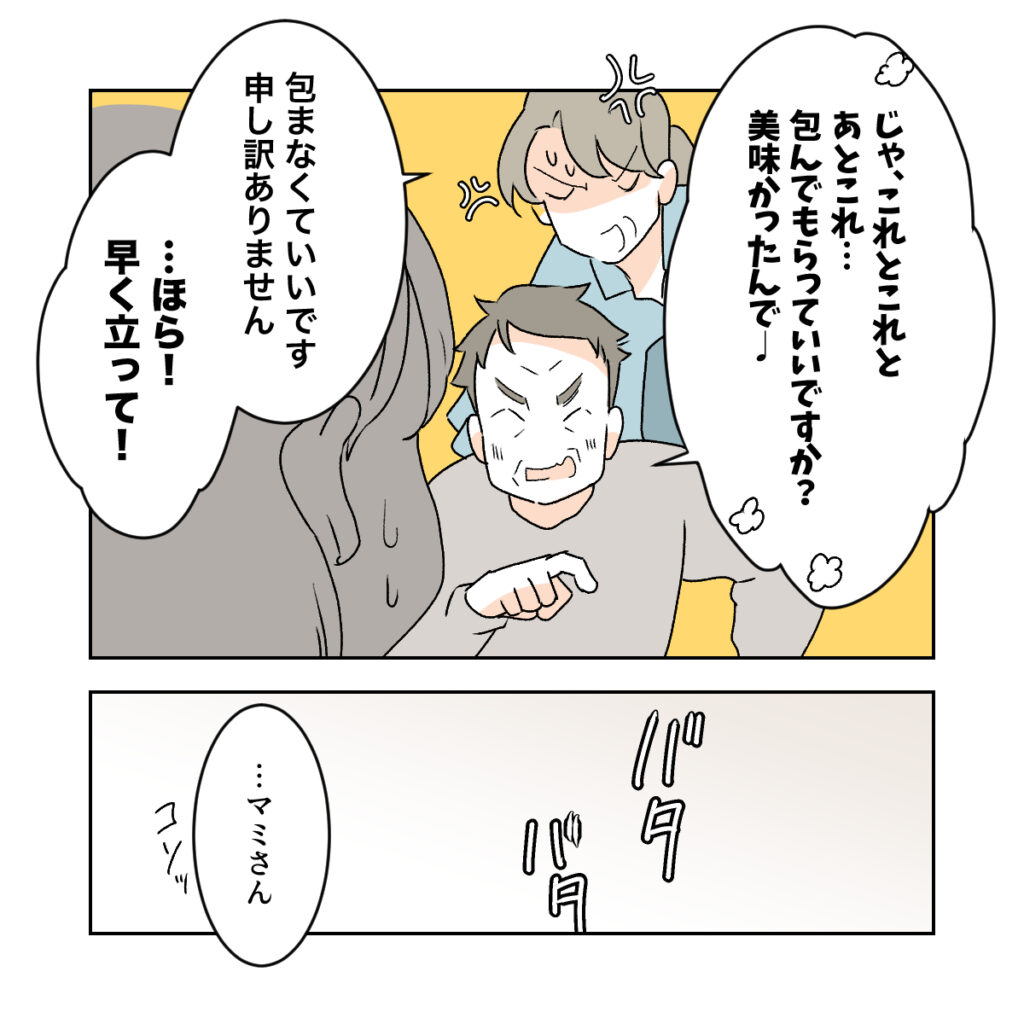 「じゃ、これとこれと・・・包んでもらっていいですか?美味かったんで」自分の非常識な振る舞いが原因で早く帰ることになっているのに、まったく気付かず能天気に言う義父。義母は義父の服をガシッと掴み、「申し訳ありません、ほら早く立って!」と急かします。