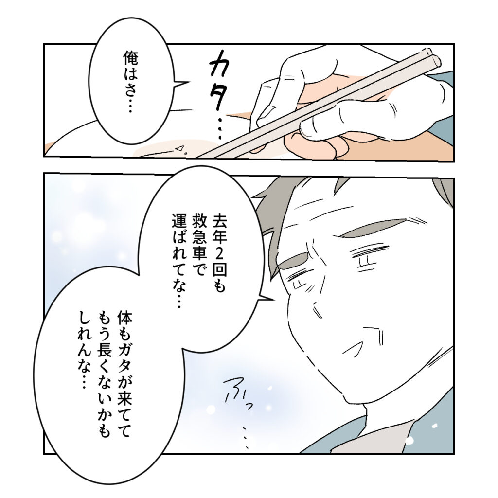 すると、さっきまで上機嫌で話していた義父がそっと箸を置き「俺はさ・・」と静かに話し始めました。「去年2回も救急車で運ばれてな・・。体もガタが来ててもう長くないかもしれんな・・」と遠い目をしてしんみりする義父。