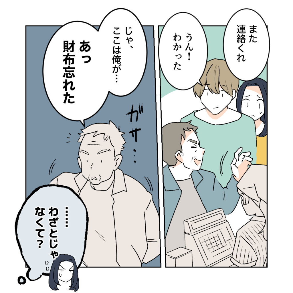 「また連絡くれ」「うん!わかった」不安げな私をよそに、楽しそうに会話を続ける2人。義父はレジの前に立つと「じゃ、ここは俺が・・・」と財布を出すふりをしますが、次の瞬間「あっ財布忘れた」と一言。わざとらしい言い方に、私の中の不信感はさらに強まります。
