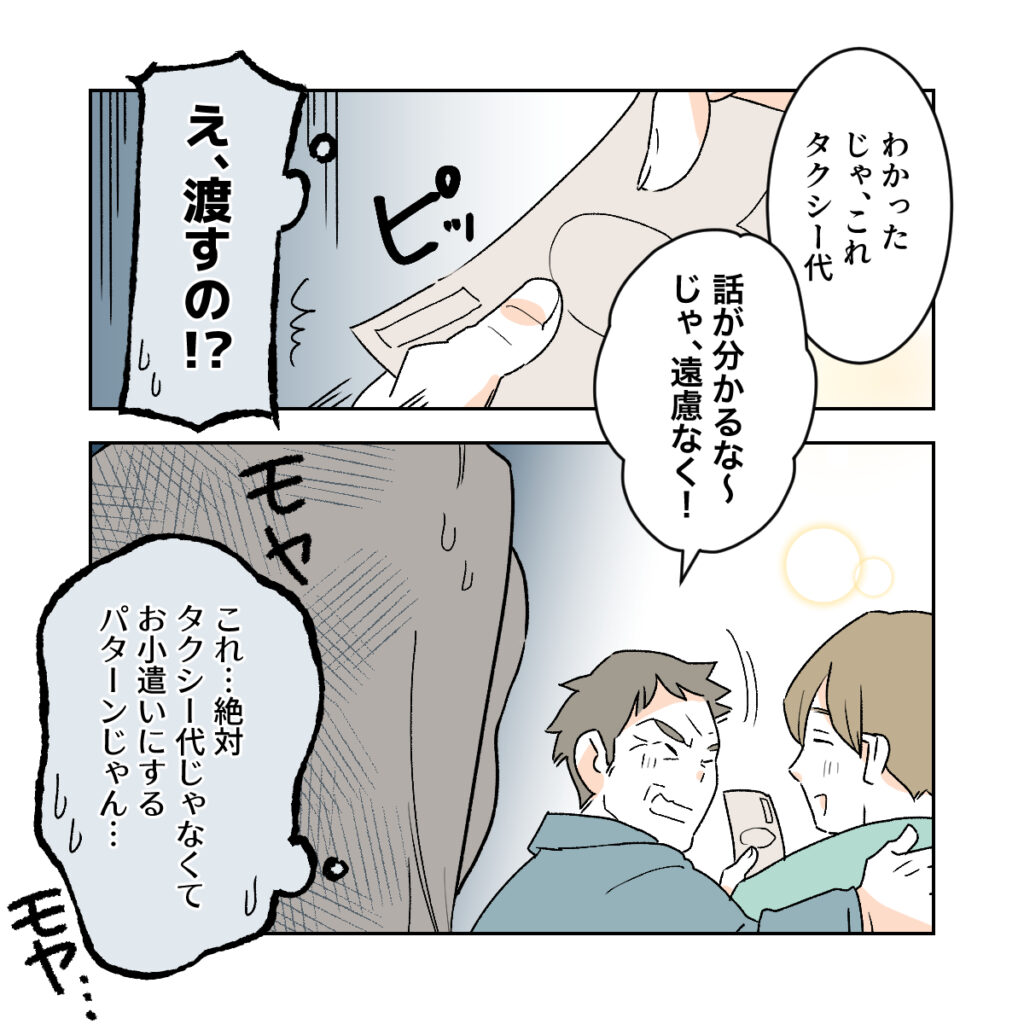 すると、ショウタは「わかった、じゃこれタクシー代」とお金を渡します。義父は嬉しそうに「話が分かるな~じゃ、遠慮なく!」と堂々とお金を受け取りました。これ、絶対タクシー代じゃなくてお小遣いにするパターンじゃん・・・私はモヤモヤするも、2人を眺めることしかできませんでした。