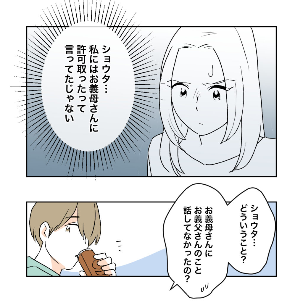 「ショウタ・・私にはお義母さんに許可取ったって言ってたじゃない」と心の中で呟いた後、「ショウタ・・どういうこと?お義母さんにお義父さんのこと話してなかったの?」と聞くと、
