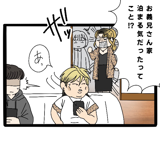 「お義兄さん家に泊まる気だったってこと!?」と言いながらサチさんがリビングに入ると、「あっ」と言って気まずそうな顔で信也君が振り返りました。