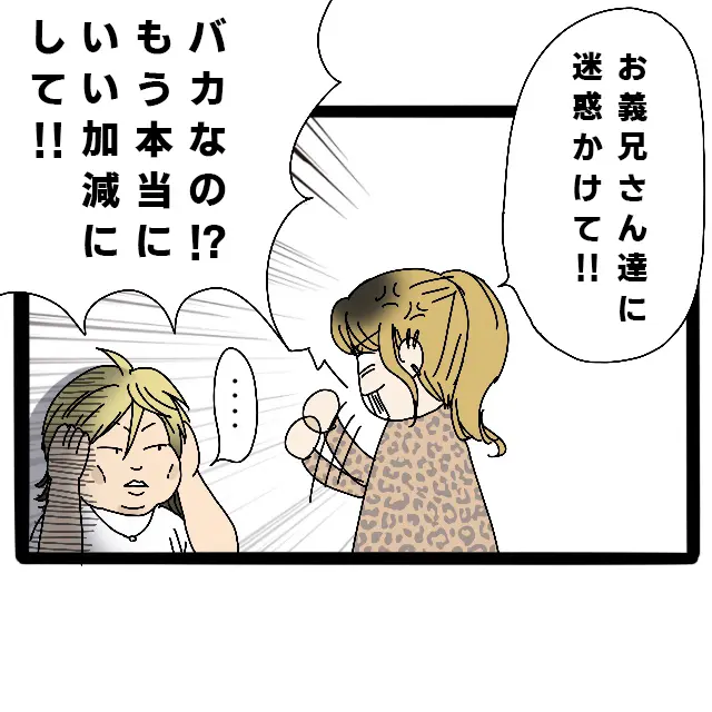 「お義兄さん達に迷惑かけて!!バカなの!?もう本当にいい加減にして!!」サチさんは周りの迷惑も考えず自分が夜のお店に行くことしか考えていない信也君を責め立てますが、耳を塞いで他人事のように目を逸らしている信也君。あ・・全く響いてなさそう。