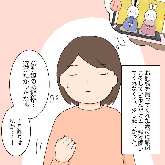 雛人形に続き、五月飾りもお義母さんの好みで選ばれそうな雰囲気ですね。息子を想ってくださる気持ちはありがたいのですが、やはり置く場所の確保問題がありますし、いよさんの意見や好みにも耳を傾けて欲しいと願いますね。