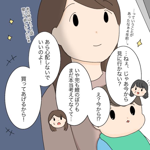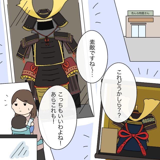 「え?今から!?・・いや兜も鯉のぼりもまだ本当考えてなくて・・」となんとか伝えますがお金の問題かと思ったのか「あら心配しないでいいのよ!買ってあげるから!」と強引に誘われてお店に行くことになってしまいました。
