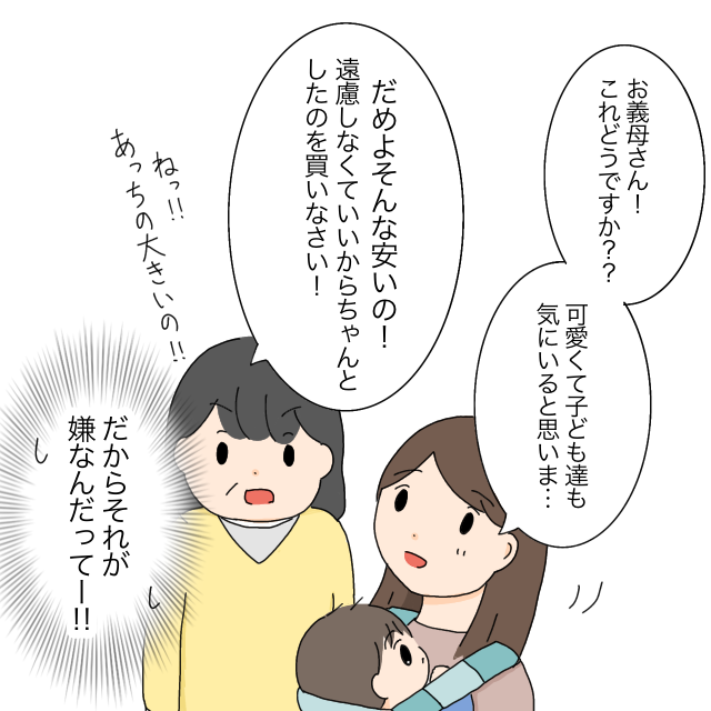 可愛い兜を見つけて嬉しくなった私はすぐにお義母さんに知らせました。「お義母さん!これどうですか??かわいくて子ども達も気に入ると思いま・・」ところが言いかけるとお義母さんは私の言葉を遮って「だめよ!そんな安いの!遠慮しなくていいからちゃんとしたのを買いなさい!ねっ!!あっちの大きいの!!」と言いました。