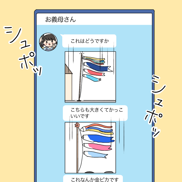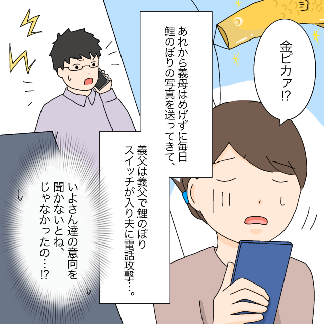どれも戸建て用の大きくて立派な鯉のぼりばかり。マンションには飾れそうにありませんが、それでも義母はめげずに毎日鯉のぼりの写真を送ってきて、義父は義父で鯉のぼりスイッチが入って夫への電話攻撃が始まりました。