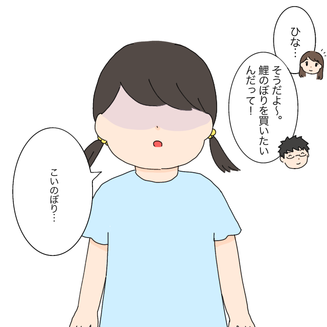 夫が「そうだよ~。鯉のぼりを買いたいんだって!」と伝えてひなの顔を見た私たちは「こいのぼり・・」と小さく呟いて暗い顔をしている娘に驚きました。