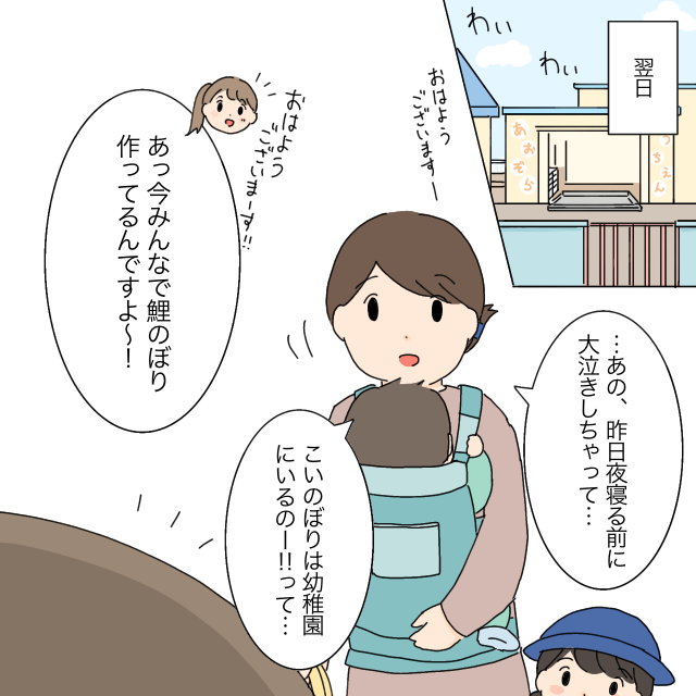 翌日幼稚園に登園した時、先生に「おはようございます。・・あの、昨日夜寝る前に大泣きしちゃって・・『こいのぼりは幼稚園にいるのー!!』って・・」と報告すると、先生は「おはようございまーす!あっ、そうなんです~!今みんなで鯉のぼりの作ってるんですよ~!」と教えてくれました。