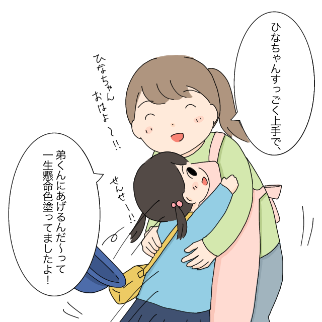 「みんな結構自由に塗ってるんですが、『どう描いたらいい?』って私達に何回も確認して真剣に色塗りしてます!色もとってもかわいいんですよ!」と先生がひなちゃんの様子を教えてくれました。弟を想って一生懸命作ってくれているひなの様子が伝わって嬉しくなりました。