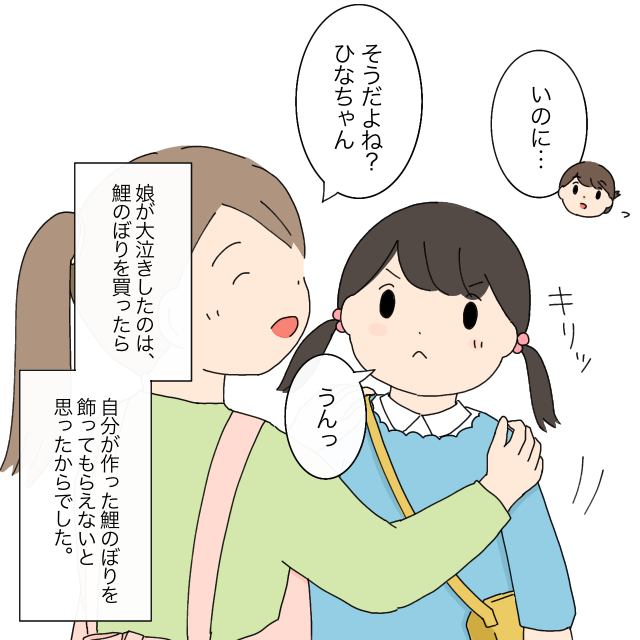 ひなが大泣きしたのは、鯉のぼりのを買ったら自分が作った鯉のぼりを飾ってもらえないと思ったからでした。ひなの涙の理由と弟への気持ち、そして一生懸命さに感動してウルッときてしまいました。