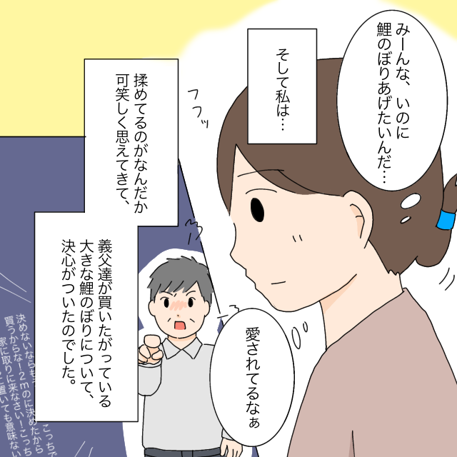 あらためて「みーんな、いのに鯉のぼりをあげたいんだ・・愛されてるなぁ」と実感した私は、義父母と揉めているのがなんだか可笑しく思えてきて、五月飾りの解決に決心がつきました。