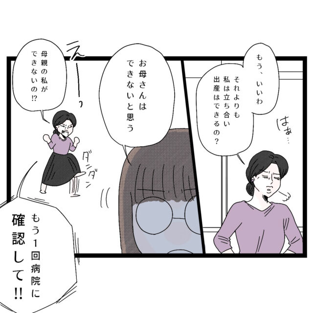 そして「はぁ・・もう、いいわ。それよりも、私は立ち合い出産できるの?」呆れたように言う実母に「お母さんはできないと思う」きっぱり答えるアサ子さん、「えーっ!母親の私ができないの!?もう1回病院に確認して!!」とすごい剣幕で言いました。