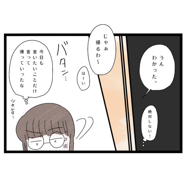 「うん、わかった」そう答えたものの「絶対しない!」と心に決めていたアサ子さん、その後「じゃあ帰るわ~」と言いサッサと帰って行った実母に「今日も言いたいことだけ言って帰っていったな。疲れた・・」アサ子さんは疲れ切ってしまいました。
