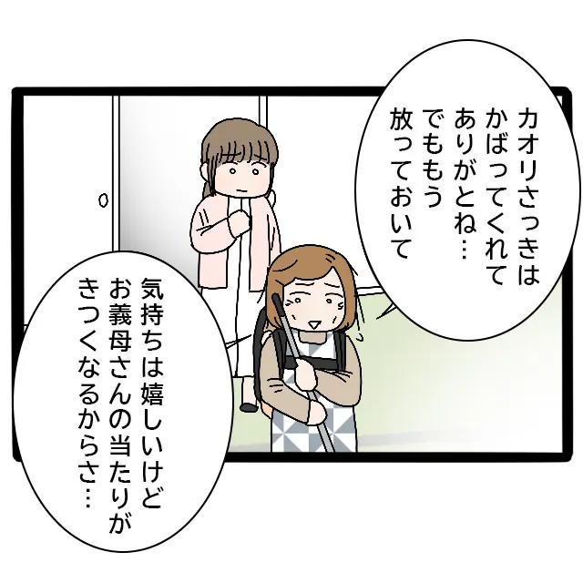 カオリさんの知っているお母さんは優しくていつもニコニコしているお母さんでしたが、今は平然と嫁いびりをしていてあまりのギャップにショックを受けるカオリさん。そして、先輩を助けてあげたいのに、その行為が逆に先輩に迷惑をかけてしまうとなるともどかしいですね。