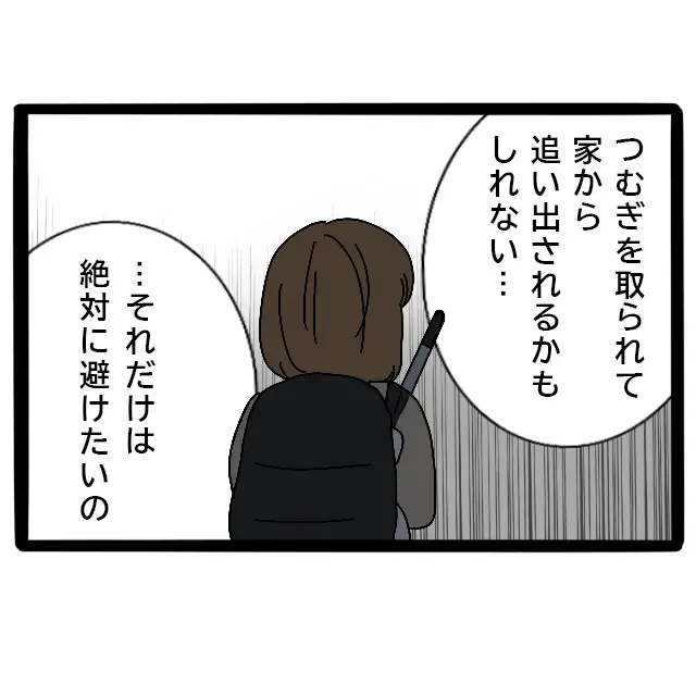 「つむぎを取られて家から追い出されるかもしれない・・。それだけは絶対に避けたいの」と絞り出すように震える声で言いました。先輩がこんな風に考えるということは、母が先輩にそう思わせる言動をしているということだと思います。いったい母は先輩にどんな酷い仕打ちをしているのか・・怖くなりました。