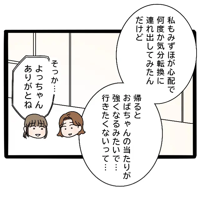 みずほ先輩が母からきつく当たられていたことを知っていたよっちゃんは、「私もみずほが心配で何度か気分転換に連れ出してみたんだけど、帰るとおばちゃんの当たりが強くなるみたいで・・行きたくないって・・」とこれまでのことを話してくれました。申し訳なさと感謝の気持ちで「そっか・・よっちゃん、ありがとね」と伝えると、