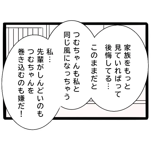 「家族をもっと見ていればって後悔してる・・。このままだと、つむちゃんも私と同じになっちゃう。私・・先輩がしんどいのもつむちゃんを巻き込むのも嫌だ!」私は思い切って母に本音をぶつけました。