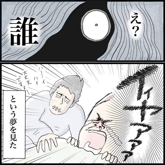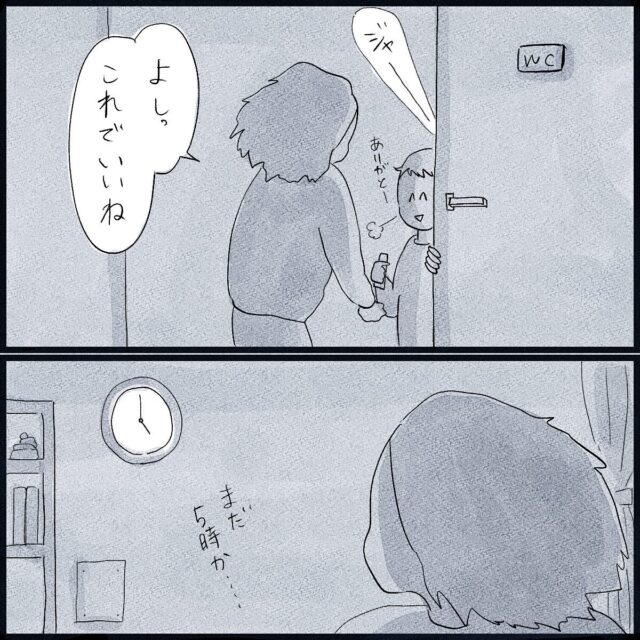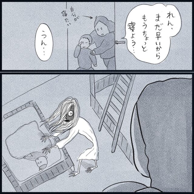 7歳長男レンくん、4歳長女すいちゃん、1歳次男ヨウちゃん、3人のお子さんのママであるhanemi(@hanma_ma)さんから、ゾッとする悪夢のお話です。明け方、尿検査の準備が上手くできないレンくんを手伝った後、もう少し寝ようと寝室へ戻ると・・・?